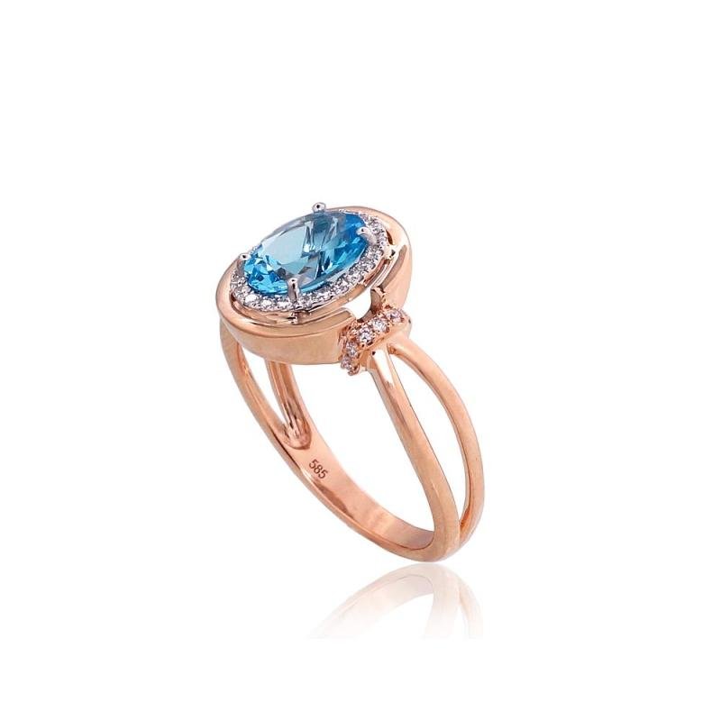Gold ring, White/Red Gold 585°, Diamonds, Blue Topaz